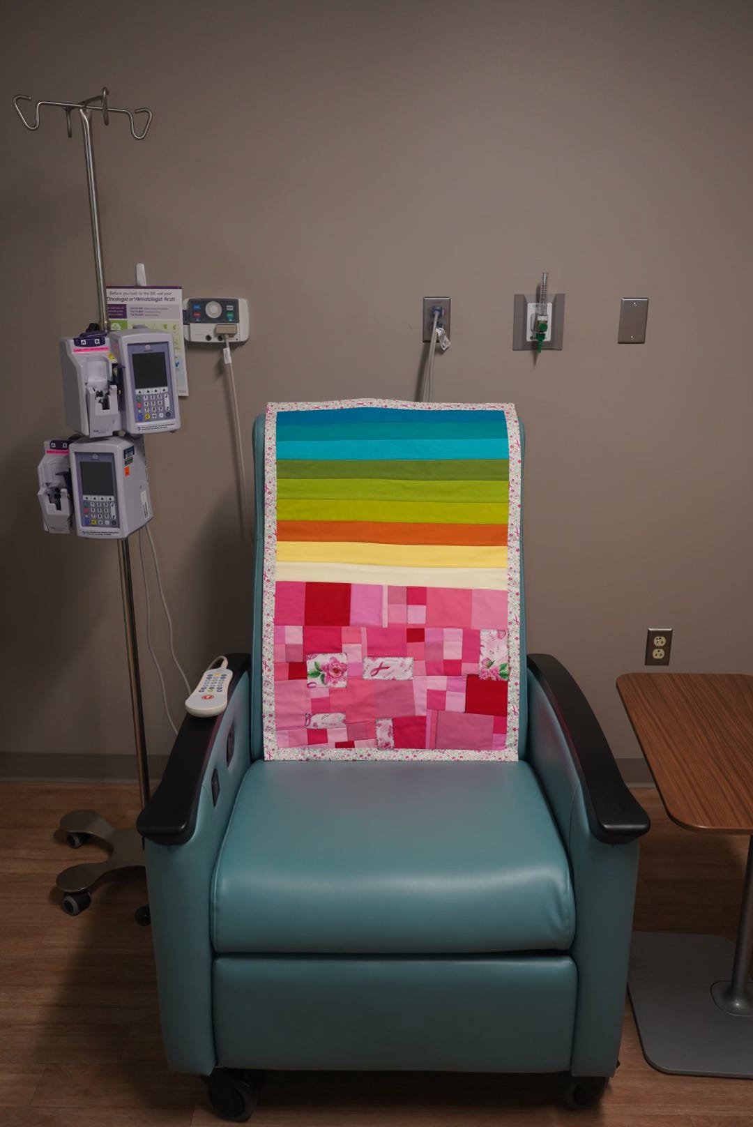 I photographed this work in the chemo bay. Because I may be cancer-free, but I am not and may never be free from forms of treatment, from scans, from all of the scar tissue, from side effects. Suddenly a quilt can be a body, a quilt can be a timeline, a quilt can be a map, a quilt can be a performance,4 a quilt can be the moment I found out.